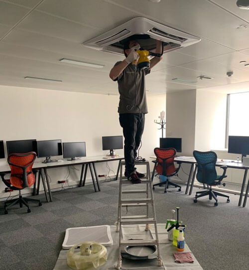 Klima Bakım işlemimiz virüs salgını nedeni ile 3 aşamadan oluşmaktadır... İlk önce, iç ünite ve filitreler kimyasal solvent ile temizlenmektedir. Sonra yüksek alkol içermekte olan özel üretim dezenfektan ile sistem mikrop ve virüslerden dezenfekte edilir. Akabinde iç ünitenin tamamı yüksek ısı üreten buhar makinası ile tamamen arındırılır.